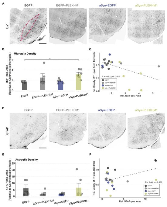 Increased microglial neuroinflammation in mice transduced with rAAV-αSyn + rAAV-PLEKHM1. (A,D) Representative images of Iba1-positive microglia (A) and GFAP-positive astrocytes (D) in the SN across all treatments. The SNc is highlighted by the pink dotted line. Cohorts are annotated above each image. Scale bar = 300 μm. (B) Iba1-positive area in the SNc as a ratio to the contralateral hemisphere. Dots represent individual animals (n = 5 in all cohorts, except n = 6 in mice transduced with rAAV-αSyn + rAAV-PLEKHM1). Comparison by a two-way ANOVA. Independent variable 1: rAAV-EGFP or rAAV-αSyn. Independent variable 2: rAAV-EGFP or rAAV-PLEKHM1. Variable 2 explains for a significant variation (F-value = 6.592, p-value = 0.02). Post hoc analysis by the Dunn test with Bonferroni correction for multiple testing suggests a significant pairwise difference between rAAV-EGFP and rAAV-αSyn + rAAV-PLEKHM1 (p-value = 0.042). Asterisks indicate significance levels (* p < 0.05). (C) Correlation of the Iba1-positive area and density of dopaminergic axon terminals. Each dot represents an individual animal. Pearson’s product–moment correlation with R = −0.52 (p-value = 0.017). Dotted line represents the corresponding generalized linear mixed model. (E) GFAP-positive area in the SNc relative to the contralateral hemisphere. No significant pairwise differences were found in statistical testing. Dots represent individual animals. (F) Correlation of the GFAP-positive area and the density of dopaminergic dendrites. Each dot represents an individual animal. Pearson’s product–moment correlation with R = 0.48 (p-value = 0.033). Dotted line represents the corresponding generalized linear mixed model.