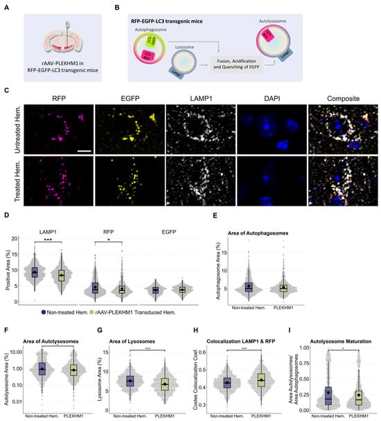 We then examined these findings in more detail. Autophagosomes were defined as being EGFP-positive and RFP-positive. We did not observe a relevant difference between cells with and without rAAV-PLEKHM1 transduction (Figure 4E). Autolysosomes were defined as being RFP-positive and EGFP-negative. The area of autolysosomes was significantly decreased in cells with rAVV-PLEKHM1 transduction compared to the uninjected hemisphere (Figure 4F). Lysosomes were defined as RFP-negative and LAMP1-positive. The area of lysosomes was lower in cells with rAVV-PLEKHM1 transduction as compared to the uninjected hemisphere (Figure 4G). Finally, we noted an increase in the colocalization coefficient for LAMP1 with RFP (Figure 4H) and a decrease in the ratio of autolysosomes to autophagosomes (Figure 4I). In summary, the area corresponding to acidic vesicles (lysosomes and autolysosomes) was decreased, but the colocalization of LAMP1 with RFP was increased.