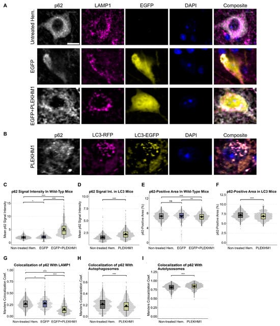 Furthermore, we analyzed the colocalization of p62 with LAMP1 in wild-type mice, as well as the colocalization of p62 with LC3 in transgenic mice (Figure 5G–I). These analyses revealed an increase in p62-LAMP1 colocalization in wild-type mice transduced with rAAV-EGFP compared with the untreated hemisphere, which was markedly reduced following Plekhm1 overexpression. In autophagy reporter mice, p62 colocalization with autophagosomes (LC3EGFP+/RFP+) was significantly decreased, whereas colocalization with autolysosomes (LC3EGFP−/RFP+) was increased.