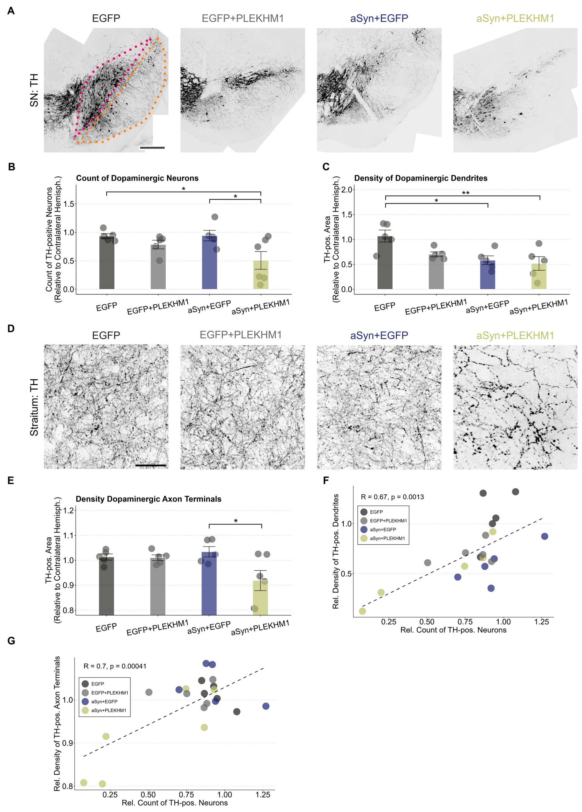 3.2. PLEKHM1 Overexpression Exacerbates αSyn-Induced Degeneration of the Nigrostriatal Pathway