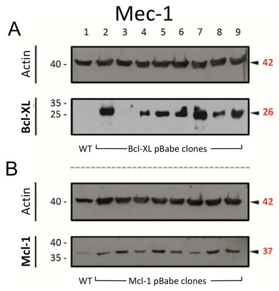 Protein expression of (A) Bcl-XL and (B) Mcl-1 in Mec-1 WT (lane 1) and transfected clones of this cell line (lanes 2–9) by Western blot. Actin was used as loading control. Numbers on the side of the immunoblots correspond to the molecular weight of the proteins expressed in kDa.