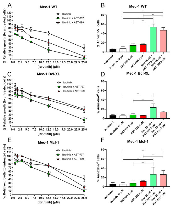 MTT assays revealed that ibrutinib alone affected all three cell lines equally, with very similar dose–response curves, obtaining IC50 values of 19 µM for Mec-1 WT and 22 µM for Mec-1 Bcl-XL or Mec-1 Mcl-1 cells (Figure 2A,C,E). In contrast, co-incubation with either ABT-737 or ABT-199 did not affect the three cell lines to the same extent. The synergistic effect was clearly detected in Mec-1 WT cells, since ABT-199 and ABT-737 decreased the IC50 to 10 µM and to 5 µM, respectively. In the case of Mec-1 Bcl-XL cells, ABT199 did not improve the IC50, while ABT737 reduced it to 13 µM, while in Mec-1 Mcl-1 cells ABT199 partially lowered the IC50 to 18 µM and ABT737 to 13 µM.