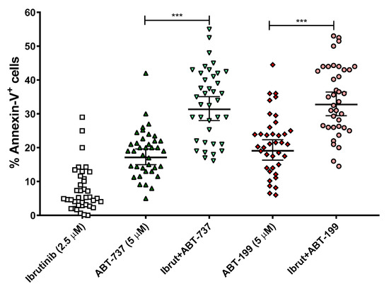 Effect of ABT-737/ABT-199 and/or ibrutinib in cell apoptosis in ex vivo samples from B-CLL patients. Cells were seeded and incubated for 24 h with ABT-737/ABT-199 (5 μM) and/or ibrutinib (2.5 μM). After this, flow cytometry was then employed for apoptosis evaluation. Data are reflected as the mean ± SD of percentage of annexin-V-positive cells. n = 38. ** p < 0.01; *** p < 0.001.