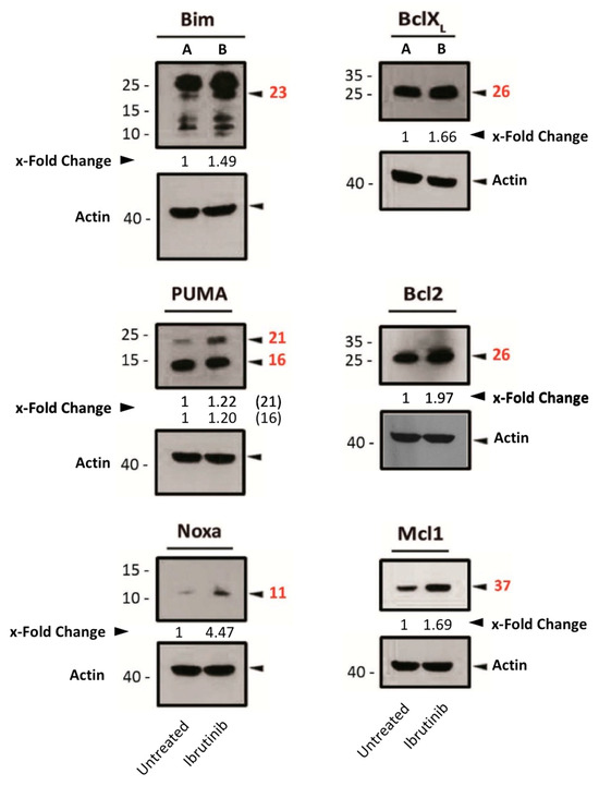 Expression analysis of several pro- or anti-apoptotic proteins in Mec-1 WT after ibrutinib incubation (20 μM, 24 h) by Western blot. Protein extracts from cells were extracted following ibrutinib exposure, samples were loaded into several electrophoresis gels and separation of proteins, transfer onto membranes and Western blots were performed, as indicated in the Material and Methods. Bcl-2, Bcl-XL, Bim, Mcl-1, Noxa, PUMA and actin (as loading control) were analyzed. x-Fold Changes were obtained by calculating the ratio of each protein with its actin control and then dividing again by the corresponding ‘Untreated’ sample. Numbers on the side of the immunoblots correspond to the molecular weight of the proteins expressed in kDa.