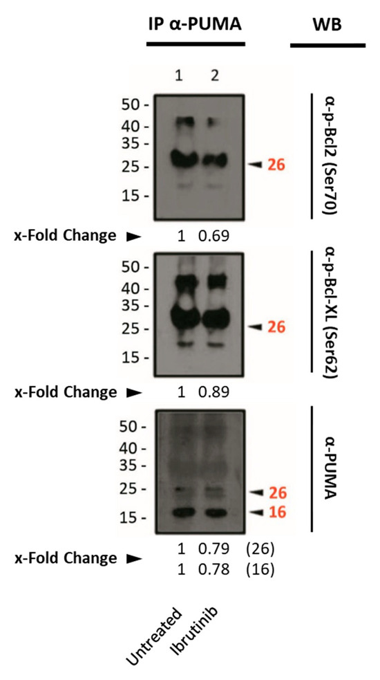 Western blot analysis of the phosphorylated form of the anti-apoptotic proteins Bcl-XL and Bcl-2 from the extracts obtained by immunoprecipitation after Mec-1 WT cell line treatment with ibrutinib (20 μM, 24 h). An antibody against PUMA was used as an immunoprecipitating agent. Ser70 and Ser62 were analyzed as targets for phosphorylation for Bcl-2 and Bcl-XL, respectively. IP: immunoprecipitated phase; WB: Western blot. x-Fold Changes were calculated by dividing the densitometry value obtained for each protein by its corresponding untreated control. Numbers on the side of the immunoblots correspond to the molecular weight of the proteins expressed in kDa.