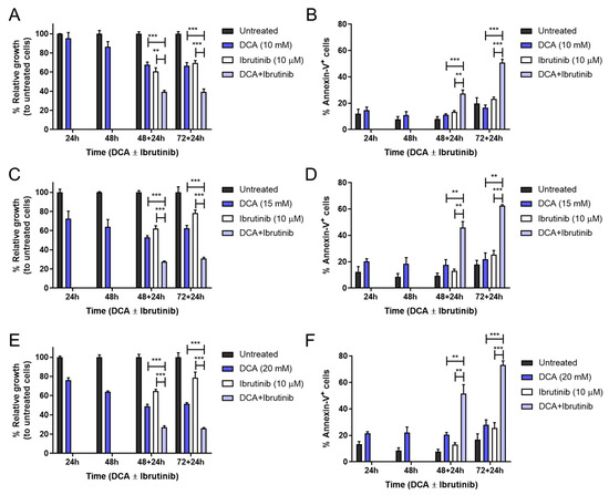 Effect of DCA and/or ibrutinib on cell growth and apoptosis in Mec-1 WT cells. Cells were seeded and preincubated for 24–72 h with DCA (10 mM in (A,B); 15 mM in (C,D); 20 mM in (E,F)). After 48 and 72 h, ibrutinib (10 μM) was added for another 24 h. MTT assays (A,C,E) were then performed for cell growth assessment, while flow cytometry (B,D,F) was employed for apoptosis evaluation. Data from MTT are expressed as the mean ± SD of percentage of relative growth, compared to untreated cells; data from flow cytometry are reflected as the mean ± SD of percentage of annexin-V-positive cells. n = 2–4. ** p < 0.01; *** p < 0.001.