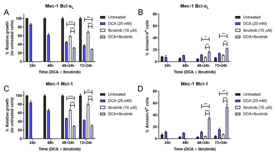 Effect of DCA and/or ibrutinib on cell growth and apoptosis in Mec-1 Bcl-XL (A,B) and Mec-1 Mcl-1 (C,D) cells. Cells were seeded and preincubated for 24–72 h with DCA (20 mM). After 48 and 72 h, ibrutinib (10 μM) was added for another 24 h. MTT assays (A,C) were then performed for cell growth assessment, while flow cytometry (B,D) was employed for apoptosis evaluation. Data from MTT are expressed as the mean ± SD of percentage of relative growth, compared to untreated cells; data from flow cytometry are reflected as the mean ± SD of percentage of annexin-V-positive cells. n = 2–4. * p < 0.01; ** p < 0.01; *** p < 0.001.