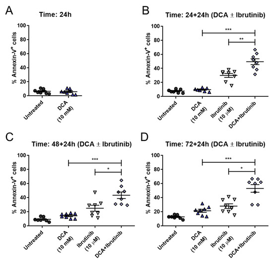 DCA concentrations achieved in vivo are around 0.5 and 5 mM [33]. The concentrations used in this work are somewhat higher, although the in vivo treatment is extended for several months or years, while our incubations last no longer than 72 h. Regardless, the conditions closer to the in vivo conditions should be those in which the lower 10 mM concentration is used. As shown in Figure 8, pretreatment with 10 mM DCA achieved significant sensitization to the action of ibrutinib at all times tested in cells from B-CLL patients. Cell apoptosis reached around 50 percent at 24 + 24 h, similar to 48 + 24 h or 72 + 24 h. This behavior is clinically relevant, as shorter times for treatment are always more convenient. Furthermore, when comparing these results with those obtained at 10 mM DCA in Mec-1 WT cells, apoptosis achieved by the combination is very similar (see Figure 6B).