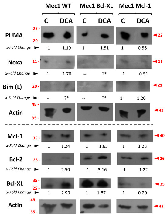 Expression analysis of several pro- or anti-apoptotic proteins in Mec-1 WT, Mec-1 Bcl-XL and Mec-1 Mcl-1 cells, after DCA incubation (5 mM, 72 h) by Western blot. Protein extracts from cells were extracted following DCA exposure, samples were loaded into several electrophoresis gels and separation of proteins, transfer into membranes and Western blots were performed, as indicated in the Material and Methods. PUMA, Noxa, Bim (L, or 23 kDa), Bcl-2, Bcl-XL, Mcl-1 and actin (as loading control) were analyzed. x-Fold Changes were obtained by calculating the ratio of each protein with its actin control and then dividing again by the corresponding ‘Untreated’ sample. Lanes with the “?*” symbol could not be quantified because of the low level of the signal. Numbers on the side of the immunoblots correspond to the molecular weight of the proteins expressed in kDa.