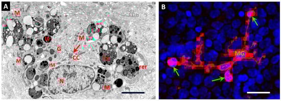 Microglia have a similar, though not identical, phenotype and ontogeny with all tissue macrophages and a common embryonic origin in the yolk sac [25,26,27]. Importantly, like other tissue-specific macrophages, microglia maintain a self-sustaining population throughout adult life, with an insignificant contribution from circulating mononuclear cells [28,29]. Also, in common with other myeloid macrophages, microglial cells demonstrate a massive phagocytic capacity and an elaborate lysosomal apparatus (Figure 1A) that permits the phagocytic engulfment and intracellular degradation of several apoptotic cells simultaneously (Figure 1B). However, it has recently been shown that although digestion of enclosed dead cells may continue for an extended period, microglia may only engulf one additional apoptotic neuron at any given time [30]. During early development of the CNS, microglia are the only professional phagocytes within the neural ectoderm as they enter the primitive neural tube prior to neurogenesis, and are therefore on site during a period undergoing a high level of apoptosis in neural precursors [31,32]. However, it should be recognized that during the very early stages of neural development, the role of non-professional phagocytes is central, and in the primitive retina, the neuroepithelial cells function in this role [33].