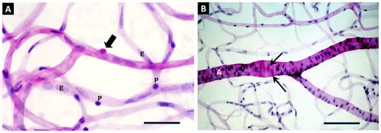 (A): Digest preparation of retinal vasculature from a 5-year-old diabetic dog depicts a capillary bed showing a pericyte “ghost” within the vascular basement membrane (arrow). The ghost cell is stained magenta with the PAS reaction and contains a hematoxylin-stained remnant of nuclear chromatin. Darkly-stained nuclei of the viable pericytes (P) and large pale nuclei of the endothelial cells (E). Bar: 50 µm. (B): Digest preparation of retinal vasculature from a 7-year-old spontaneously diabetic dog featuring a retinal arteriole (A). A dilated portion of the arteriolar wall contains several fusiform remnants of vascular smooth muscle cells (arrows), stained magenta with PAS. Bar: 100 µm. (From Gardiner et al. 1994 [121]).