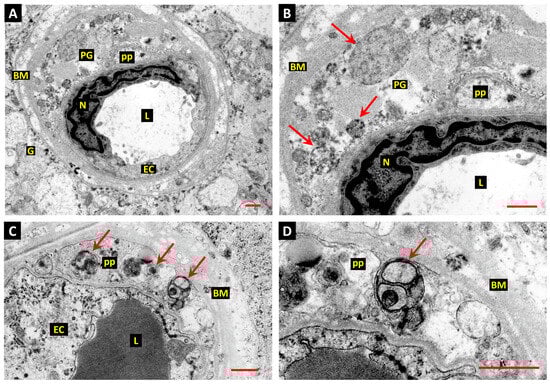(A,B): Electron micrographs of a diabetic human donor retina depict a capillary blood vessel with an intact endothelial cell (EC) and a pericyte “Ghost” (PG) within the basement membrane; the endothelial cell nucleus (N); the vessel lumen (L); and the glial cell (G). The basement membrane (BM) is grossly thickened and laminated, and the pericyte “ghost” (PG) is filled with vesicular and granular material (arrows). The plasma membrane of the ghost cell appears to have disintegrated, apart from the area surrounding a small pericyte process (pp). (C,D): A retinal capillary from a diabetic human donor shows pericyte processes (pps) with intact plasma membranes (arrows in panel C) containing multiple autophagosomes. The autophagosomes contain enclosed cytoplasm and organelles (arrows). Bars 1.0 µm. (From Gardiner & Stitt 2022 [122]).