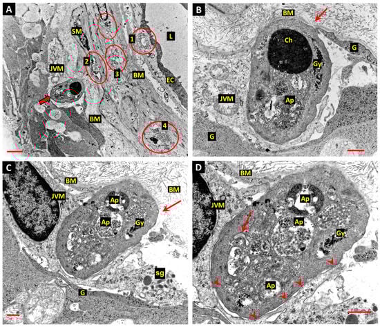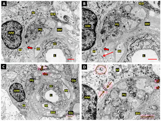 (A,B): Electron micrograph of a retinal capillary from a diabetic donor eye shows a pericyte “ghost” (PG) filled with vacuolar remnants of extreme autophagic activity within the vascular basement membrane (BM). The PG is undergoing phagocytosis by a JVM cell. The process of the JVM cell engaged in phagocytosis has infiltrated the BM, but shows cytoplasmic continuity with the cell of origin (thick arrow). An adjacent process of the JVM cell shows anchorage to the BM via a well-developed hemi-desmosome-like attachment plaque (arrow, panel B). The JVM shows aggregates of rough endoplasmic reticulum at the periphery of the cell soma (RER). Vascular lumen—L; endothelial cells—EC; pericyte processes—pps; mitochondria—M. Bars: 1.0 µm. (C,D): A deeper Z-plane of the same retinal capillary depicted in panels (A,B) provides additional detail of PG phagocytosis by the JVM cell. The extremity of the JVM process engaged in PG engulfment shows the tapered double-membrane ends of phagocytic pseudopodia (thick arrows). This profile also shows a unique form of matrix attachment by the JVM: 2 of the hemidesmosome-like attachments observed in panels A and B are anchored on the same tag of basal lamina (arrows). Glycogen granules circled in red. Bars: 1.0 µm. (From Gardiner & Stitt 2022 [123]).