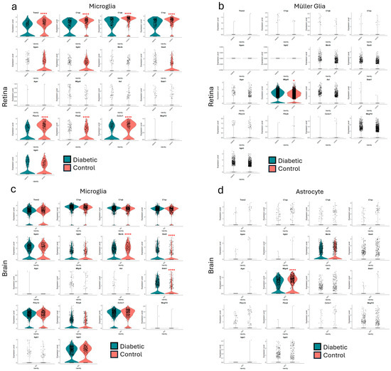 Expression of efferocytosis-related gene expression in microglia and glia cell populations of the diabetic retina (8-month-old db/db—PMID: 33674409) and brain (4-month-old db/db mice—PMID: 37351595). Single-cell RNAseq datasets were accessed from the corresponding databases and analyzed using Seurat_4.3.0 (https://satijalab.org/seurat/ (accessed on 15 July 2025) developed by P. Hoffman, S. Lab and collaborators, New York City, NY, USA). (a) Retinal microglia, (b) retinal Müller cells, (c) brain microglia, and (d) brain astrocytes. The changes reported as statistically significant had a Log2Fold Change > 0.25. * p < 0.05, **** p < 0.001. Blue = diabetic group (db/db); orange = control group (db/+).