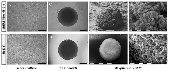 Morphological comparison of shERβ MDA-MB-231 and Hs578T BC cell lines in 2D monolayers and 3D spheroid cultures using phase-contrast and scanning electron microscopy (SEM). (A,B) Phase-contrast images of cells cultured in 2D show characteristic mesenchymal morphology with elongated spindle-like shapes for both cell lines. Black bar, 200 μm. (C,D) Phase-contrast images of intact 3D spheroids formed by each cell line demonstrate differences in compactness and edge definition. Black bar, 200 μm. (E,F) SEM images reveal ultrastructural features of the spheroids, with shERβ MDA-MB-231 forming loosely packed, irregular aggregates, whereas Hs578T spheroids appear denser and more spherical. White/black bar, 0.1 mm. (G,H) Higher-magnification SEM images highlight surface architecture, showing increased porosity and rough texture in shERβ MDA-MB-231 spheroids, compared to the more compact and smooth appearance of Hs578T spheroids. White/black bar, 10 μm.