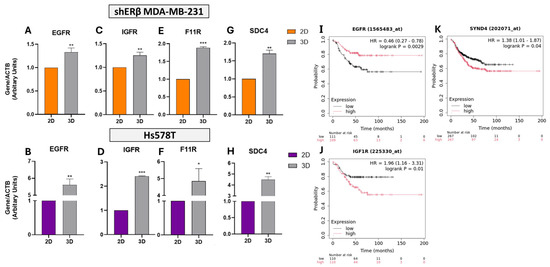 Gene expression analysis of EGFR, IGF1R, F11R, and SDC4 in shERβ MDA-MB-231 and Hs578T BC cell lines cultured in 2D monolayers and 3D spheroids. (A–H) Real-time qPCR results show that EGFR, IGFR (IGF1R), F11R (JAM-A), and SDC4 are significantly upregulated under 3D culture conditions compared to 2D in both cell lines. Orange bars represent shERβ MDA-MB-231, while purple bars represent Hs578T cells. Bars indicate mean ± SD from triplicate experiments. Each bar indicates the mean ± SD from triplicate experiments. Asterisks denote statistically significant differences between 2D and 3D conditions: (*) p < 0.05, (**) p < 0.01, and (***) p < 0.001, as determined by Student’s t-test. (I–K) Kaplan–Meier survival plots from TNBC patient datasets show that high EGFR expression is significantly associated with improved relapse-free survival (RFS) (HR = 0.46, p = 0.0029), while F11R (JAM-A) is not significantly associated with outcome (HR = 0.81, p = 0.17). In contrast, IGF1R expression correlates with worse RFS (IGF1R: HR = 1.96, p = 0.01), highlighting its potential prognostic relevance.