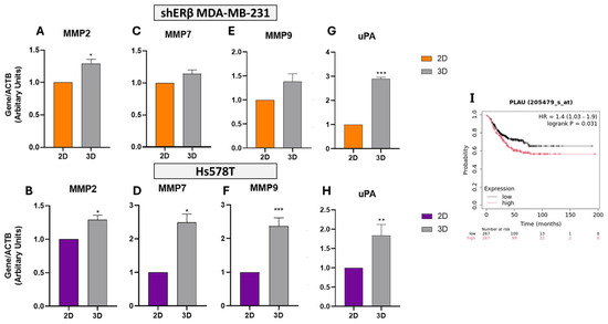 Relative expression of matrix metalloproteinases and uPA in 2D versus 3D cultures of TNBC cell lines. (A–H) Real-time qPCR analysis of MMP2, MMP7, MMP9, and PLAU (uPA) in shERβ MDA-MB-231 (orange) and Hs578T (purple) BC cell lines cultured under 2D and 3D conditions. Three-dimensional spheroid culture induced elevated mRNA expression of MMP2 and MMP7 in both cell lines, while MMP9 was robustly upregulated in Hs578T spheroids. uPA expression was significantly increased under 3D conditions in both models. Bars indicate mean ± SD from triplicate experiments. Each bar indicates the mean ± SD from triplicate experiments. Asterisks denote statistically significant differences between 2D and 3D conditions: (*) p < 0.05, (**) p < 0.01, and (***) p < 0.001, as determined by Student’s t-test. (I) Kaplan–Meier survival plot from TNBC patients (KM Plotter) showing that high PLAU expression is significantly associated with worse relapse-free survival (HR = 1.4, p = 0.031), while MMP2, MMP7, and MMP9 showed no significant survival association (MMP2: HR = 0.92, p = 0.58; MMP7: HR = 0.92, p = 0.57; and MMP9: HR = 1.05, p = 0.76).