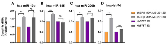 Expression levels of BC-associated microRNAs ((A) hsa-miR-10b, (B) hsa-miR-145, (C) hsa-miR-200b, and (D) hsa-let-7d) in 2D and 3D cultures of shERβ MDA-MB-231 and Hs578T BC cell lines. Real-time qPCR was performed to assess relative miRNA expression, normalized to 18srRNA. C2D and C3D represent shERβ MDA-MB-231 cells cultured in 2D and 3D, respectively (orange and light gray bars), while H2D and H3D represent Hs578T cells in 2D and 3D (purple and dark gray bars). Notably, miR-10b, miR-145, miR-200b, and let-7d showed significant regulation in 3D cultures compared to 2D in the shERβ MDA-MB-231 line, whereas no significant differences were observed in the Hs578T line. Each bar indicates the mean ± SD from triplicate experiments. Asterisks denote statistically significant differences between 2D and 3D conditions: (*) p < 0.05, (**) p < 0.01, (***) p < 0.001, and ns (or absent) = not significant as determined by Student’s t-test.