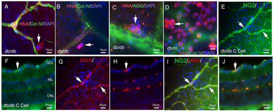 Previously, we utilized hiPSCs and differentiated them into a specific mesoderm subset characterized by KNA+ expression. We demonstrated that by day 4 in culture, iPSCs differentiated into KNA+ cells were able to generate both endothelial cells and pericytes/smooth muscle cells when embedded in collagen gel and implanted subcutaneously in NOD-SCID mice [16]. In this study, we asked if day 4 KNA+ cells could also differentiate into pericytes within the retina. To address this, we injected 1 × 105 KNA+ cells intravitreally into diabetic (db/db) and control (db/m) mice. Saline-injected db/m and db/db mice served as controls, and mice were euthanized at 1 or 2 months post-intravitreal injection. As shown in Figure 1A–C, KNA+ cell injections into the vitreous of db/db mice with 6 months of diabetes showed individual cells and clumps of perivascular cells that co-stain for human nuclear antigen (HNA). In db/m mice, the cells remained on the retinal surface, resembling cellular sheets, and were not associated with the vasculature (Figure 1D). This behavior is not unexpected, as in the db/m mice, no retinal vascular injury exists, and thus, the KNA+ cells have no signal to migrate into the retina to repair (Figure 1D). In contrast, HNA+ cells (Figure 1E–J) stain for the pericyte-specific marker NG-2, indicating the human origin of pericytes in the db/db mouse retina.