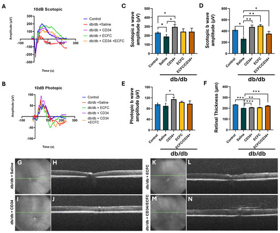 ERG and OCT changes in hiPSC-treated mice. Whole animal dark-adapted (A) and light-adapted (B) flash ERGs were performed on db/db mice. Mean waveforms in response to the 10dB light flash intensity evaluated and quantification of Scotopic a-wave amplitudes (C), Scotopic b-wave amplitudes (D), and Photopic b-wave amplitudes (E). Quantification of retinal thickness by OCT (F). En-face view of the posterior segment with the optic nerve head. The green line indicates the area of the retina where the B-scan image was taken (G,I,K,M). Representative OCT B-scan images of mouse retina from cross-sectional scan of en-face images from db/db mice injected with saline (H), iPSC-CD34+ cells (J), iPSC-ECFC (L), and the combination of iPSC-CD34+ cells and iPSC-ECFCs (N). Retinal thickness was assessed by OCT. When compared to saline-injected mice, total retinal thickness significantly improved in mice injected with hiPSC-CD34+, hiPSC-ECFCs, and the combination of cells. * p ≤ 0.05, ** p ≤ 0.005, and *** p ≤ 0.0005. The number of injected db/db mice in each group was as follows: Saline: n = 7; iPSC-CD34+: n = 5; iPSC-ECFCs: n = 4; iPSC-CD34+/iPSC-ECFCs: n = 5. Injected db/m mice: Saline: n = 5.