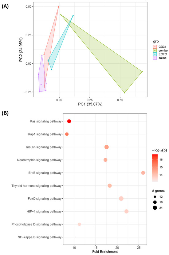 The unexpected observation that CD34+ cells alone provided more functional improvement, as assessed by ERG, than the combination of CD34+ cells and ECFCs prompted us to investigate differences in signaling mechanisms. To this end, we performed functional proteomic analysis using RPPA on retinal tissues from the five experimental cohorts. Differential expression analysis, clustering, and pathway enrichment were conducted to interpret the biological significance of the observed changes. Principal component analysis (Figure 4A) reveals treatment-driven separation along PC1 (35.1% of total variance), with saline, iPSC-CD34+ cells, and iPSC-ECFC samples clustering together on the left side while combination treatment samples occupy a distinct position on the right side. PC2 (24.95% of variance) captures primarily intra-group heterogeneity rather than inter-treatment differences. As shown in Figure 4A, the complexity of cellular signaling increased progressively from saline-treated controls to hiPSC-CD34+ cells, hiPSC-ECFCs, and, as expected, was highest in the combination group.