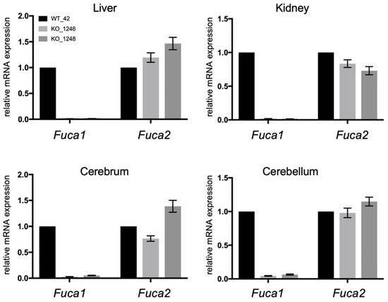 We wondered whether the loss of Fuca1 gene expression might be compensated by an increased expression of the Fuca2 gene. Transcript levels of mouse Fuca1 and Fuca2 were determined by quantitative (q)PCR using RNA from various tissues of 6-month-old wild-type (#42) and Fuca1-KO mice (#1246, #1248), respectively (Figure 2). In wild-type tissues, Fuca1 and Fuca2 were expressed at similar levels in the kidney, cerebrum, and cerebellum, as indicated by comparable cycle threshold (Ct) values: 21.18 (Fuca1) and 20.81 (Fuca2) in the kidney; 23.88 (Fuca1) and 23.95 (Fuca2) in the cerebrum; 23.66 (Fuca1) and 23.89 (Fuca2) in the cerebellum. Only in the liver was Fuca1 expression (Ct 22.95) higher than that of Fuca2 (Ct 25.90). In Fuca1-KO tissues, Fuca1 transcripts were nearly absent, while Fuca2 expression levels remained almost unchanged in all tissues, independent of Fuca1 expression, suggesting that the loss of Fuca1 has no direct compensatory impact on Fuca2 expression.