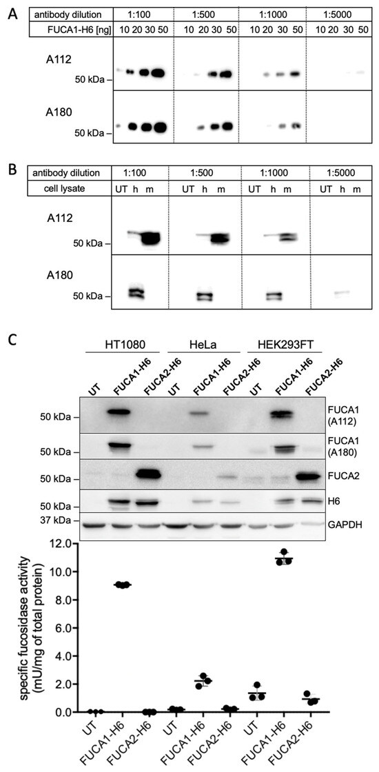 Commercially available antibodies and antisera directed against lysosomal tissue α-L-fucosidase (FUCA1-encoded) failed to specifically detect human and mouse recombinant α-L-fucosidase 1. Therefore, we immunized Fuca1-KO mice by ballistic injection of coated gold particles carrying an untagged mouse Fuca1 cDNA construct (pcDNA3.1Hygro(+)-Fuca1). The same mice were further boosted with purified H6-tagged human α-L-fucosidase 1 protein (FUCA1-H6), resulting in a mouse serum that sensitively detected recombinant human FUCA1 in a low nanogram range. To obtain a sustainable source for monoclonal antibodies against FUCA1, antibody-producing hybridoma cell lines were established using standard protocols. Two supernatants from the hybridoma cell lines A112 and A180, respectively, showed high sensitivity for recombinant glycosylated human FUCA1 with an apparent molecular mass of 50–55 kDa, even at high dilutions of the supernatants (1:1000) in a dose-dependent manner (Figure 3A).