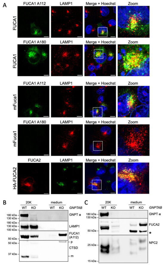 The novel FUCA1 antibodies failed to detect endogenous Fuca1 on multiple tissue western blots from wild-type and Fuca1-KO mice. However, endogenous FUCA1 and FUCA2 were detected in 20,000× g (20K) lysosome-enriched fractions prepared from human wild-type (WT) haploid HAP1 cells (Figure 4B,C). In contrast, HAP1 cells in which the gene encoding the Golgi-resident GlcNAc-1-phosphotransferase α/ß subunit precursor protein (GNPTAB) was deleted by CRISPR-Cas9 gene editing showed decreased levels of FUCA1 in the 20K lysosomal fraction, whereas the abundance of other lysosomal enzymes, such as FUCA2 and cathepsin D (CTSD), or of the luminal accessory protein Niemann-Pick type 2C (NPC2), was strongly reduced. The loss of GlcNAc-1-phosphotransferase prevents the modification of luminal lysosomal proteins with M6P targeting signals, resulting in the missorting of a significant proportion of these newly synthesized proteins into the medium rather than correctly directing them to lysosomes. Lysosomal membrane proteins like LAMP1 remained unaffected due to their M6P-independent transport to lysosomes. These results demonstrate that the sorting of both lysosomal α-L-fucosidases, FUCA1 and FUCA2, is strongly M6P-dependent.