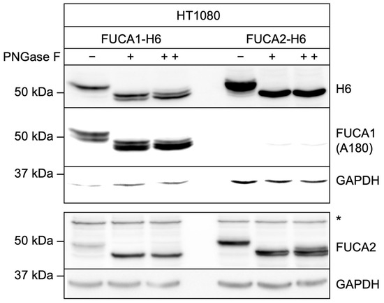 To examine the N-glycosylation of both fucosidases, HT1080 cell lysates ectopically expressing FUCA1-H6 and FUCA2-H6 were treated with or without PNGase F and analyzed by western blotting (Figure 5). A moderate decrease in the apparent molecular mass from 53/55 kDa to approx. 50 kDa was observed for both fucosidases, indicating the loss of 2–3 N-linked oligosaccharides. Furthermore, deglycosylation of FUCA2-H6 did not enable its detection by the A180 antibody. In contrast, the A180 antibody detected three deglycosylated bands for FUCA1-H6, while the H6-specific antibody, which detects the C-terminal H6-tag, only recognized two bands, suggesting that the H6-tag might be partially cleaved off.