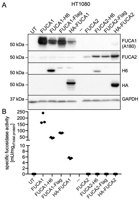 In western blots of HT1080 cell lysates, the A180 antibody detected all human FUCA1 derivatives, namely untagged, H6-, Flag-, and HA-tagged FUCA1 (Figure 6A). Densitometric analysis showed that, compared to untagged FUCA1, the expression levels of H6-tagged FUCA1, Flag-tagged FUCA1, and the HA-tagged variant were 58%, 80%, and 29%, respectively. The FUCA2 antibody detected all FUCA2 derivatives, as well as FUCA2 at low endogenous levels in lysates with ectopic FUCA1 expression and in untransfected (UT) HT1080 cells. To verify the expression levels of FUCA1 and FUCA2, we used H6- and HA-tag-specific antibodies, showing that the intensity of the FUCA1-H6 band was significantly higher than that of FUCA2-H6, whereas the HA signal was slightly stronger for HA-FUCA2 than for HA-FUCA1.