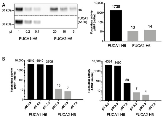 (A) Aliquots of affinity-purified FUCA1-H6 and FUCA2-H6 derived from supernatants of stably expressing HT1080 cells were analyzed by western blotting (left panel), and fucosidase activity was determined using pNPF as a pseudo-substrate (right panel). (B) Aliquots of the elution fractions (1 µL FUCA1-H6 and 10 µL FUCA2-H6) were used for α-L-fucosidase activity assays using pNPF (left) or 4-MUF (right) as pseudo-substrates at the indicated pH values.