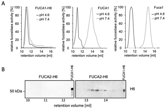 Previously, a pH-dependent tetramerization or even higher forms of oligomerization of FUCA1 have been discussed [38,39], and very recently, the homotetrameric structure of human recombinant FUCA1 was shown by cryo-EM [14]. The capability of FUCA2 to oligomerize has not been investigated so far. We purified untagged FUCA1 using strong ion-exchange chromatography (SCX), FUCA1-H6, and FUCA2-H6 by Ni-NTA chromatography, and additionally obtained native mouse Fuca1 from lysosome-enriched fractions (so-called tritosomes) from mouse liver. These different purified FUCA1/Fuca1 forms, as well as the affinity-purified FUCA2-H6, were analyzed by size exclusion chromatography (SEC) at lysosomal and neutral pH. For the different FUCA1 derivatives, collected fractions were tested for α-L-fucosidase activity (Figure 8A), while FUCA2-H6 was detected by H6-tag western blotting due to the lack of α-L-fucosidase activity (Figure 8B). Under acidic conditions, recombinant FUCA1-H6 (Figure 8A, left panel) as well as untagged FUCA1 (Figure 8A, middle panel) eluted in an oligomeric form, with apparent molecular masses of 200–300 kDa according to the standard protein calibration (see Supplementary Figure S4). Moreover, fucosidase activity derived from wild-type mouse liver tritosomes was detected at a comparable retention volume at acidic pH, also demonstrating an oligomeric Fuca1 in mouse liver lysosomes (Figure 8A, right panel). Under neutral conditions (pH 7.4), we observed differences between the FUCA1-H6 and the untagged forms of FUCA1 (middle panel), and Fuca1 (right panel), which eluted only as approx. 50 kDa monomers. In contrast, FUCA1-H6 appeared as an oligomer at both pH values (left panel). Affinity-purified H6-tagged FUCA2 was accordingly separated by SEC and was detectable in fractions corresponding to the monomeric form (Figure 8B). In summary, these data suggest a pH-dependent oligomerization of FUCA1/ Fuca1, whereas FUCA2 shows no oligomerization.