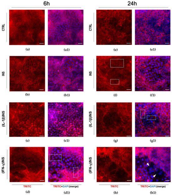 Furthermore, the differentiated monolayers were primed for 24 h with IL-1β or IFN-γ and only after that were stimulated for 6 or 24 h with INS. Cells primed with IL-1β and next treated with INS for 6 h showed no specific alterations of the cytoskeletal structure compared to untreated control cells (Figure 2c); contrarily, after 24 h of INS stimulation, cells appeared different in shape and size compared to untreated controls, with cytoskeletal actin elements heterogeneously marked (thickened or disrupted, Figure 2g, see representative areas in white rectangles and Supplementary Material File S1 for higher magnification). IFN-γ administration induced the most significant effects on actin cytoskeleton organization in association with INS. Monolayers pre-treated with IFN-γ and then stimulated with INS for 6 h showed partial depolymerization of actin filaments in cell-cell contact areas with the loss of homogeneity in cell shape and size compared to untreated control cells (Figure 2d; see representative areas in white rectangles and Supplementary Material File S1 for higher magnification). Prolonged exposure to INS (24 h) of the monolayer pre-treated with IFN-γ remarkably enhanced the effects previously described: The organization of adjacent cells was strongly altered, showing severe discontinuity in cell-cell borders (Figure 2h, white arrowheads). In contrast to the highly regular 2D architecture of untreated control monolayers, the mosaic-like organization underwent substantial alterations, with cells losing the regular polygonal geometry, becoming enlarged with partly roundish shape and variable size (Figure 2h).