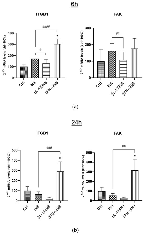 In parallel, the mRNA expression analysis of genes related to cytoskeletal dynamics, i.e., integrin β1 (ITGB1) and focal adhesion kinase (FAK), has been performed to check the activation of morphological processes undergoing the experimental conditions. According to the morphological analysis of cytoskeletal actin, mRNA expression variations induced by INS have been shown to follow a general dependence on time (Figure 3). After 6 h of INS stimulation, FAK mRNA expression analysis showed no significant variations in all experimental conditions compared to untreated controls; nevertheless, its expression levels were found to be significantly lower in (IL-1β)INS monolayers compared to INS-treated cells (Figure 3a). The ITGB1 mRNA underwent a regulatory trend similar to FAK: Its expression was significantly reduced by pre-treatment with IL-1β compared to INS-treated cells, but, different from FAK, ITGB1 mRNA was significantly increased by IFN-γ pre-treatment compared to both untreated controls and INS-treated cells (Figure 3a). Interestingly, in cells exposed to INS for 24 h, the qPCR analysis showed an identical trend for both ITGB1 and FAK mRNAs, with the (IFN-γ)INS treatment inducing significant upregulation of both mRNAs compared to both untreated controls and INS-treated cells (Figure 3b); moreover, this upregulation was much more marked than that observed with only 6 h of INS stimulation.