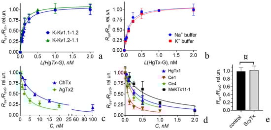 - Orlov, N.A.; Kryukova, E.V.; Efremenko, A.V.; Yakimov, S.A.; Toporova, V.A.; Kirpichnikov, M.P.; Nekrasova, O.V.; Feofanov, A.V. Interactions of the Kv1.1 Channel with Peptide Pore Blockers: A Fluorescent Analysis on Mammalian Cells. Membranes 2023, 13, 645. [Google Scholar] [CrossRef] [PubMed]
