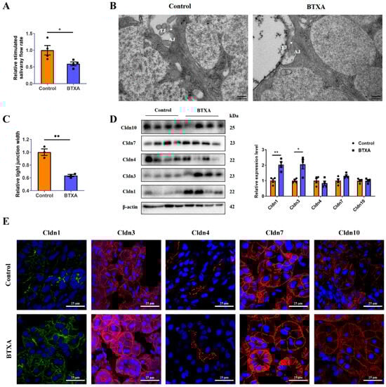 Claudin-1 and Cldn3 expression is upregulated in the BTXA group. (A) Stimulated salivary flow rates of control and BTXA group. (B) Transmission electron microscopy images of TJs (white arrows) in the SMGs of control and BTXA group. (C) Statistical analysis of TJ width in the rat SMGs. (D) The protein levels of Cldn1, Cldn3, Cldn4, Cldn7, and Cldn10 between the control and BTXA group. (E) Immunofluorescence staining of Cldn1, Cldn3, Cldn4, Cldn7, and Cldn10 in SMGs of the control and BTXA group. TJ, tight junction; AJ, adherens junction; SMG, submandibular gland; Cldn, claudin. Data are presented as mean ± SEM; n = 3–4, * p < 0.05; ** p < 0.01 compared with control group.