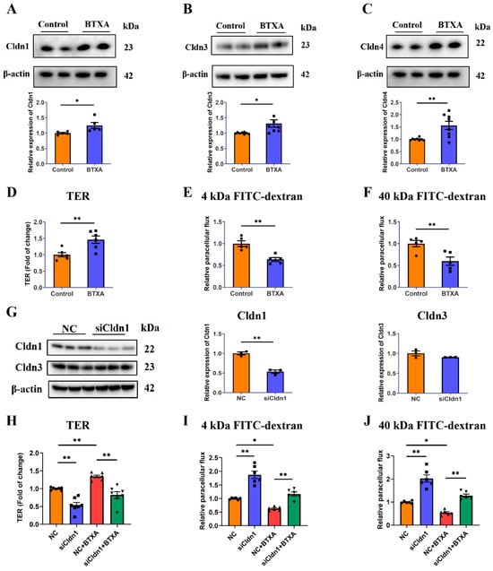 Claudin-1 is required for BTXA-induced reduction in paracellular permeability. (A–C) The protein levels of Cldn1 (A), Cldn3 (B), and Cldn4 (C) in BTXA-treated SMG-C6 cells. (D) The effect of BTXA on the TER values of SMG-C6 cells. (E,F) The effect of BTXA on the paracellular flux of 4 kDa (E) and 40 kDa FITC-dextran (F). (G) The protein levels of Cldn1 and Cldn3 after transfecting SMG-C6 cells with Cldn1-specific siRNA. (H) The TER values of Cldn1-knockdown SMG-C6 cells. (I,J) The paracellular flux of 4 kDa (I) and 40 kDa FITC-dextran (J) of Cldn1-knockdown SMG-C6 cells. SMG-C6 cells treated with 50 U/mL BTXA for 24 h. TER, transepithelial electrical resistance; Cldn, claudin. Data are presented as mean ± SEM; n = 5–8, * p < 0.05; ** p < 0.01 compared with control group.