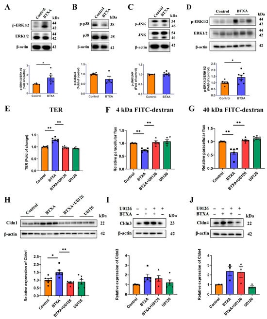 Further, we examined the effects of BTXA-induced ERK1/2 activation on TJ molecules. Western blot analysis revealed that U0126 reversed the BTXA-induced upregulation of Cldn1 (Figure 3H), while the expression levels of Cldn3 and Cldn4 remained unaffected (Figure 3I,J). These findings suggest that the ERK1/2 pathway mediates upregulation of Cldn1 expression by BTXA.