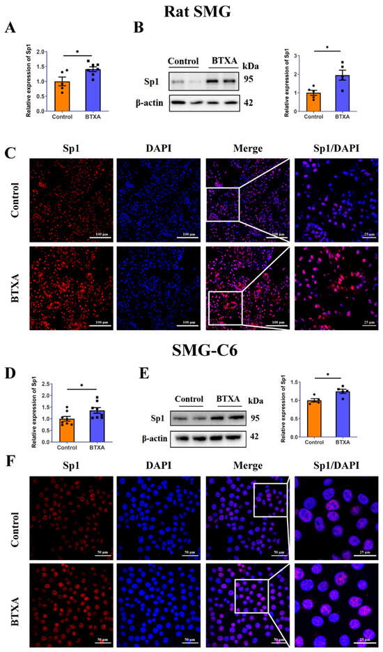 Sp1 is increased in the BTXA-treated submandibular glands and SMG-C6 cells. (A) The mRNA levels of Sp1 in rat SMGs. (B) The protein levels of Sp1 in rat SMGs. (C) Immunofluorescence staining of Sp1 in rat SMGs. (D) The mRNA levels of Sp1 in BTXA-treated SMG-C6 cells. (E) The protein levels of Sp1 in BTXA-treated SMG-C6 cells. (F) Immunofluorescence staining of Sp1 in BTXA-treated SMG-C6 cells. SMG-C6 cells treated with 50 U/mL BTXA for 24 h. SMG, submandibular gland; Sp1, specificity protein-1. Data are presented as mean ± SEM; n = 5–8, * p < 0.05, compared with control group.
