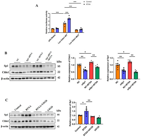 The results of the ChIP experiment conducted by our research group revealed that, in SMG-C6 cells, Sp1 could bind to the promoter region of Cldn1 at −284 to −84 bp [19]. On this basis, we constructed wild-type binding site plasmids (Luc-Cldn1-WT) and mutant binding site plasmids (Luc-Cldn1-MUT) within the −300 to −75 bp region of the Cldn1 promoter. A luciferase reporter assay revealed that luciferase activity decreased following transfection with Luc-Cldn1-MUT. Moreover, in the Luc-Cldn1-WT group, BTXA significantly increased luciferase activity (Figure 5A), suggesting that BTXA promotes the binding of Sp1 to the promoter region of Cldn1. Furthermore, the use of siRNA to knockdown Sp1 expression helped elucidate the regulatory role of Sp1 in Cldn1. The results showed that the decreased expression of Sp1 effectively reversed the upregulation of Cldn1 induced by BTXA (Figure 5B). These results indicated that Sp1 acted as a transcriptional activator of Cldn1 and that BTXA could increase the transcription of Cldn1 by promoting the binding of Sp1 to the promoter region of Cldn1.