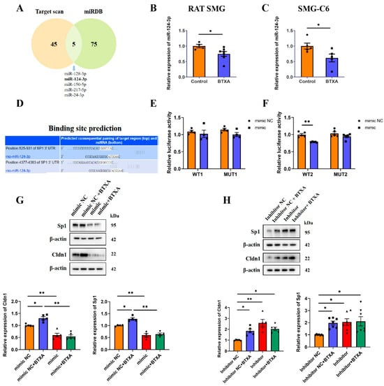 MiRNAs serve as a regulatory mechanism for the expression of TJ proteins. By analyzing potential miRNAs that regulate Sp1 via the TargetScan and miRDB databases, we identified an intersection of five miRNAs: miR-128-3p, miR-124-3p, miR-150-5p, miR-217-5p, and miR-24-3p (Figure 6A). High-throughput sequencing revealed that BTXA downregulated the expression of miR-124-3p [17], a finding further validated by qRT-PCR in both rat SMGs and SMG-C6 cells (Figure 6B,C). The TargetScan database showed that the Sp1 3′-UTR contained two conserved binding sites for miR-124-3p (Figure 6D). To investigate these interactions, we constructed wild-type (Luc-Sp1-3′UTR-WT) and mutant (Luc-Sp1-3′UTR-MUT) plasmids. Luciferase reporter assays indicated that the miR-124-3p mimic reduced luciferase activity in cells transfected with the Luc-Sp1-3′-UTR-Wt plasmid, specifically at the second binding site located at nucleotides 4377-4383 of the Sp1 3′UTR (Figure 6E,F). This finding suggests that Sp1 is a direct target of miR-124-3p in SMG-C6 cells. Furthermore, overexpression of miR-124-3p reduced Sp1 and Cldn1 expression, reversing the BTXA-induced upregulation of these proteins (Figure 6G). Conversely, inhibition of miR-124-3p led to increased Sp1 and Cldn1 expression in SMG-C6 cells (Figure 6H).