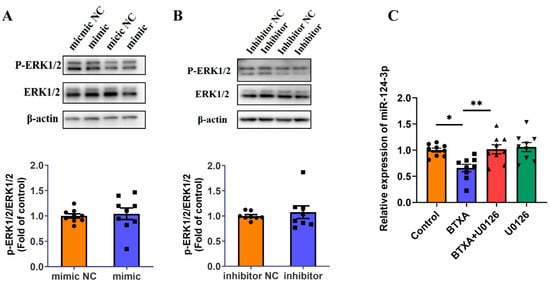 ERK1/2 pathway is activated and involved in BTXA’s downregulation of miR-124-3p expression. (A,B) Western blot analysis of ERK1/2 phosphorylation after transfecting SMG-C6 cells with miR-124-3p mimic (A) or inhibitor (B). (C) The expression levels of miR-124-3p after preincubating with U0126. SMG-C6 cells treated with 50 U/mL BTXA for 24 h. Data are presented as mean ± SEM; n = 8–9, * p < 0.05; ** p < 0.01 compared with control group.