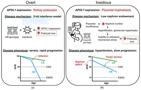 Proposed mechanistic difference between the varied presentations of APOL1 kidney disease. (a) The best understood presentation of APOL1 kidney disease is an overt, rapidly progressive CKD that is typically associated with a viral infection or other chronic inflammatory state. These inflammatory conditions are associated with high interferon levels which induce APOL1 expression in kidney podocytes resulting in dramatic podocyte losses and nephrotic range proteinuria. The overt presentation best fits the proposed two-hit model for APOL1 kidney disease pathogenesis. (b) Less understood is the insidious presentation of APOL1 kidney disease, a subclinical disease that is characterized by slowly progressive losses in GFR, frequently with hypertension. This presentation of APOL1 kidney disease is similar to CKD that can develop as a consequence of prematurity and low birth weight through a mechanism caused by low nephron endowment. A developmental deficit in nephron numbers predisposes kidneys to gradual, chronic podocyte loss from compensatory mechanisms related to countering the mechanical strain during filtration. Thus, with the evidence for APOL1 expression in placental trophoblasts and the association of fetal APOL1 high-risk genotypes with preeclampsia and low birth weight, it is possible that a similar CKD mechanism for podocyte loss may underlie the insidious presentation of APOL1 kidney disease. In this potential mechanism, podocyte losses would not require ongoing expression of APOL1 in the kidney but are founded in the effect of APOL1 expression during pregnancy and also would not require a second hit to cause CKD. HR, high-risk APOL1 genotype; LR, low-risk APOL1 genotype, CKD, chronic kidney disease, ESKD, end stage kidney disease, GFR, glomerular filtration rate.