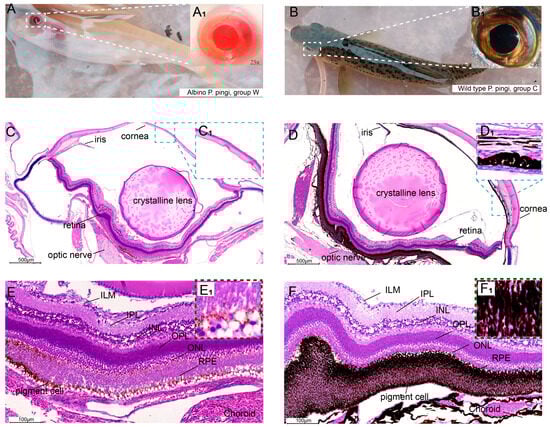Clinical and H&E staining results. (A) Clinical phenotype of group W. (B) Clinical phenotype of group C. (C) H&E staining of the eyeballs in group W, with a lack of pigment granules. C1: Magnification of the blue box in Figure C. (D) H&E staining of the eyeballs in group C, with rich pigment granules. D1: Magnification of the blue box in Figure D. (E) Retina of group W; E1: A small number of brown-yellow granules. (F) Retina of the group C; F1: A large number of melanin granules. ILM: internal limiting membranes. IPL: inner plexiform layer. INL: internal nuclear layer. OPL: outer plexiform layer. ONL: outer nuclear layer. RPE: retinal pigment epithelial layer.