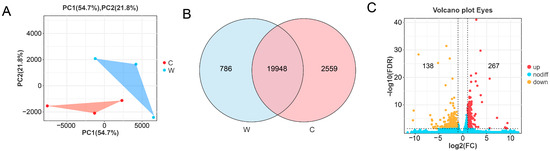 Total RNA was isolated from eye samples (3 samples per group) using Trizol reagent (Takara Bio, Ohtsu, Japan) following the manufacturer’s instructions. The concentration and purity of the RNA were detected by Nanodrop2000 (Thermo, Waltham, MA, USA), while agarose gel electrophoresis was applied to assess RNA integrity, and Agilent 2100 (Santa Clara, CA, USA) was utilized to determine the RNA Integrity Number (RIN) value. Samples meeting the standards (total RNA ≥ 1 μg, RNA concentration ≥ 45 ng μL−1, 1.8 ≤ OD260/280 ≤ 2.2, 2.0 ≤ OD260/230 ≤ 2.2) were used for subsequent tests. After total RNA extraction, eukaryotic mRNA was enriched by oligo (dT) beads. These beads specifically bind to the poly(A) tail of eukaryotic mRNA, separating it from other RNAs (such as rRNA or tRNA) to focus downstream experiments on mRNA.