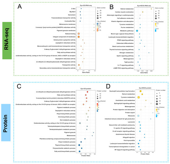 GO enrichment and KEGG enrichment analysis of DEGs in the transcriptome and proteome. (A,B) GO enrichment and KEGG enrichment analysis of DEGs between two groups in transcriptome, respectively. (C,D) GO enrichment and KEGG enrichment analysis of DEPs between two groups in proteome, respectively. The vertical axis represents the name of the pathway, and the horizontal axis (Rich factor) represents the ratio of sample number to background number. The size and color of the dots represent the number of genes and the adjusted p-value for each pathway, respectively. The smaller the p-value (the darker the color), the stronger the association between the pathway and the studied phenotype, and the higher the credibility.