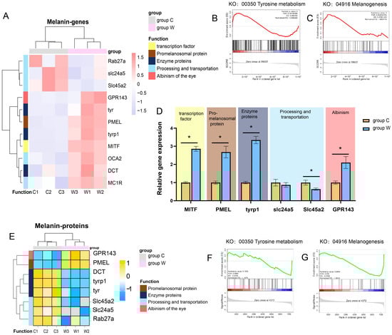 Transcriptome and proteomic results related to melanin synthesis. (A) Heatmap of melanin synthesis-related genes with z-score normalized expression levels between the two groups. (B,C) GSEA of tyrosine metabolism (KO: 00350) and melanogenesis (KO: 04916) in the transcriptome, respectively. (D) Expression levels of key genes regulating melanin synthesis. (E) Heatmap of melanin synthesis-related proteins with z-score normalized abundance between the two groups. (F,G) GSEA of tyrosine metabolism (KO: 00350) and melanogenesis (KO: 04916) in the proteome, respectively. * p < 0.05, n = 3.
