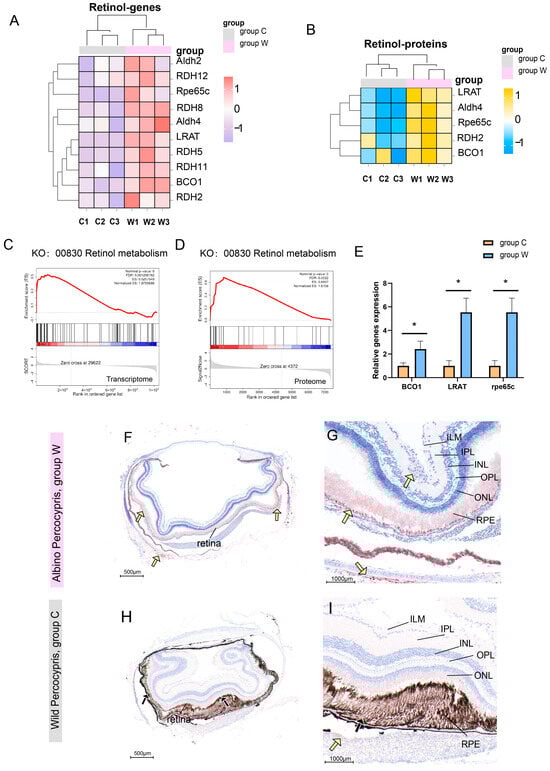 Results related to excessive activation of retinol metabolism. (A) Heatmap of retinol metabolism-related genes with z-score normalized expression levels between the two groups. (B) Heatmap of retinol metabolism-related proteins with z-score normalized abundance between the two groups. (C) GSEA of retinol metabolism (KO: 00830) in the transcriptome. (D) GSEA of retinol metabolism (KO: 00830) in the proteome. (E) Expression levels of key genes regulating retinol metabolism. (F–I) Oil Red O staining of eye tissues. (F) Eye tissues of group W lacked melanin granules but contained abundant carotenoid particles (yellow arrows). (G) Abundant carotenoid particles (yellow arrows) were distributed in the RPE of group W, with occasional carotenoid particles in the ILM. (H) Control group eye tissues showed abundant melanin (black arrows). (I) In the control group, occasional carotenoid particles were observed (yellow arrows). * p < 0.05, n = 3. ILM: internal limiting membranes. IPL: inner plexiform layer. INL: internal nuclear layer. OPL: outer plexiform layer. ONL: outer nuclear layer. RPE: retinal pigment epithelial layer.
