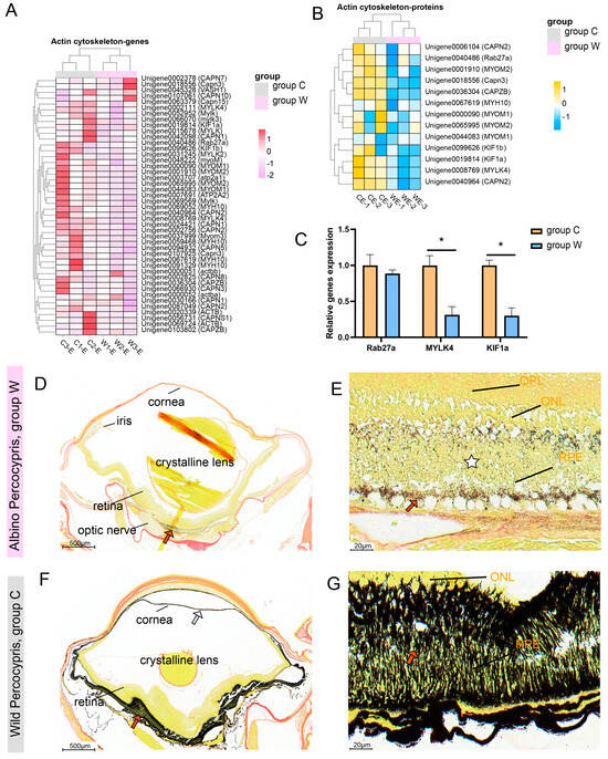 Results related to abnormal cytoskeletal function. (A) Heatmap of cytoskeletal-related genes with z-score normalized expression levels between the two groups. (B) Heatmap of cytoskeletal-related proteins with z-score normalized abundance between the two groups. (C) Expression levels of key genes regulating the cytoskeleton. (D–G) Masson–Fontana staining of eye tissues. (D) Sparse melanin granules (arrows) in eye tissues of group W. (E) Melanin in the RPE of group W predominantly deposited in the basal region (arrows) with reduced apical distribution (star). (F) Abundant melanin (arrows) in control group eye tissues. (G) Uniform distribution of melanin granules in both basal and apical regions of the control group RPE (arrows). * p < 0.05, n = 3. OPL: outer plexiform layer. ONL: outer nuclear layer. RPE: retinal pigment epithelial layer.