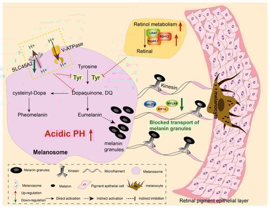 Melanosomes are specialized intracellular organelles for melanin production and storage in melanocytes, distributed across multiple tissues and organs, including the skin, hair, and eyes [43]. After gradual formation and maturation within melanocytes (stages I–IV), melanosomes rely on a molecular motor system for transcellular transport. Long-distance transport relies on kinesin moving along microtubule tracks, while short-range trafficking is mediated by the actin network (predominantly F-actin) [44]. In RPE of eye tissues, microtubule motor transport mediated by kinesin plays a critical role in delivering melanosomes to the actin-rich apical domain of the RPE cells [45].